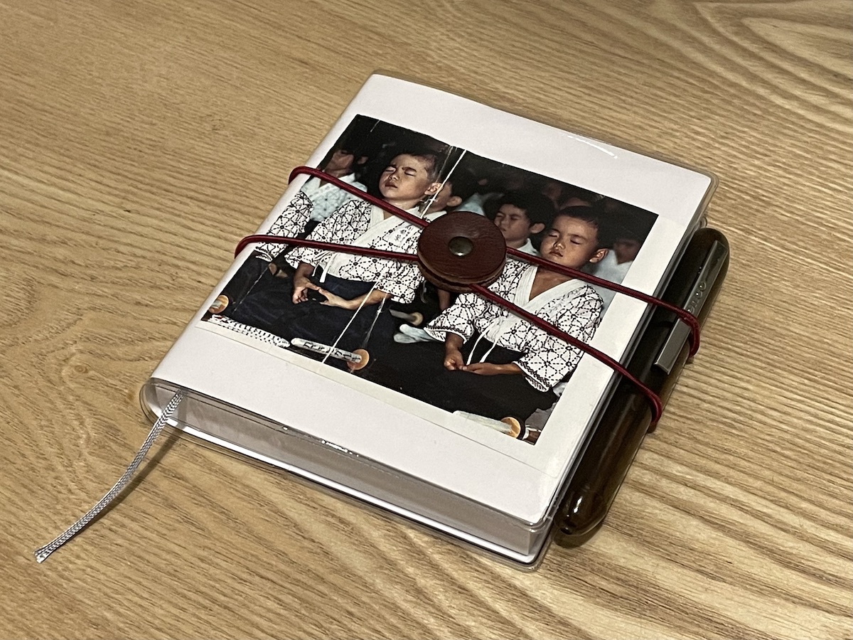 While the minimalistic design of the inner pages were what drew me in, the minimalistic design of the cover, I felt, was lacking. Luckily, the diary comes in a clear plastic jacket, so customizing the cover is as easy as inserting whatever you want into the plastic jacket. Rummaging through my collection of stationery - papers, stickers, and random scraps I’ve collected over the years, I found this adorable photo of some little kids meditating that I once cut out of an old magazine. I love their stern expressions as they struggle to concentrate. I inserted it into the cover of my diary. Next I added this Hightide “Penco Bullet Ballpoint Pen Light” that matches the size of the diary perfectly when capped, and finally this Laccio rivet book band. (I know, this is all getting a bit materialistic for a hobby that’s supposed to be about detachment from earthly desires). Now I was happy with the outward appearance of my Breath Diary.