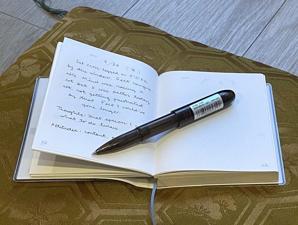 Also from the aforementioned article, I got the idea of jotting down a couple “thoughts” and “attitudes” - distracting thoughts that popped up in your head during your session (e.g. things you want to buy, imagined conversations), and attitudes that were present (e.g. curiosity, kindness, frustration, optimism). So my diary entries these days consist of a sentence or two reflecting on my session in general, and then a list of any thoughts and attitudes that came up. This system is working well for me, and I would invite others to try it as well.
